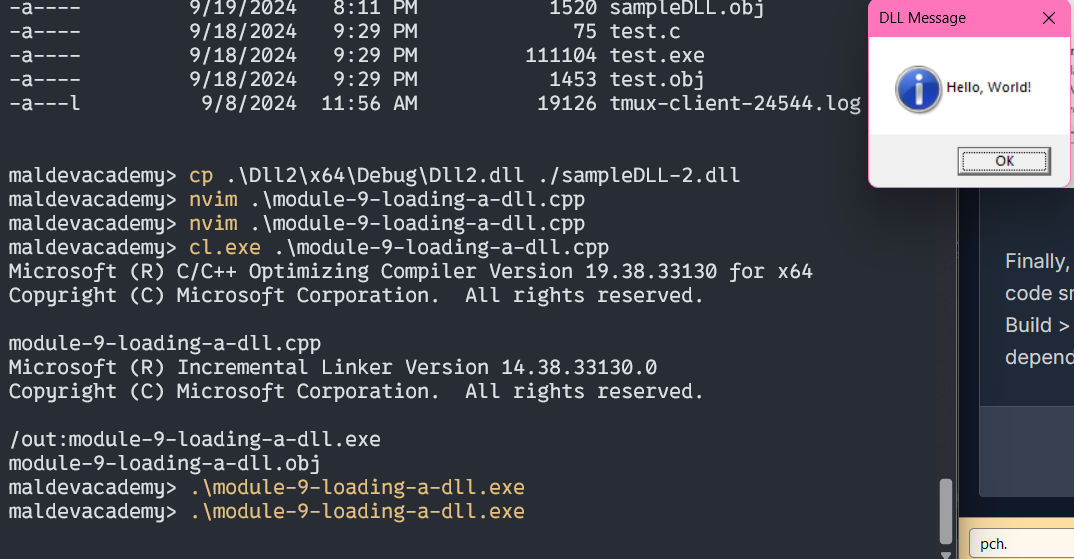 - DLL compileren werkt voor sampleDLL.dll niet met cl.exe /LD, maar wel met Visual Studio Code (go figure). Aanroepen MessageBoxA vanuit .exe die de DLL laadt, werkt 🤘