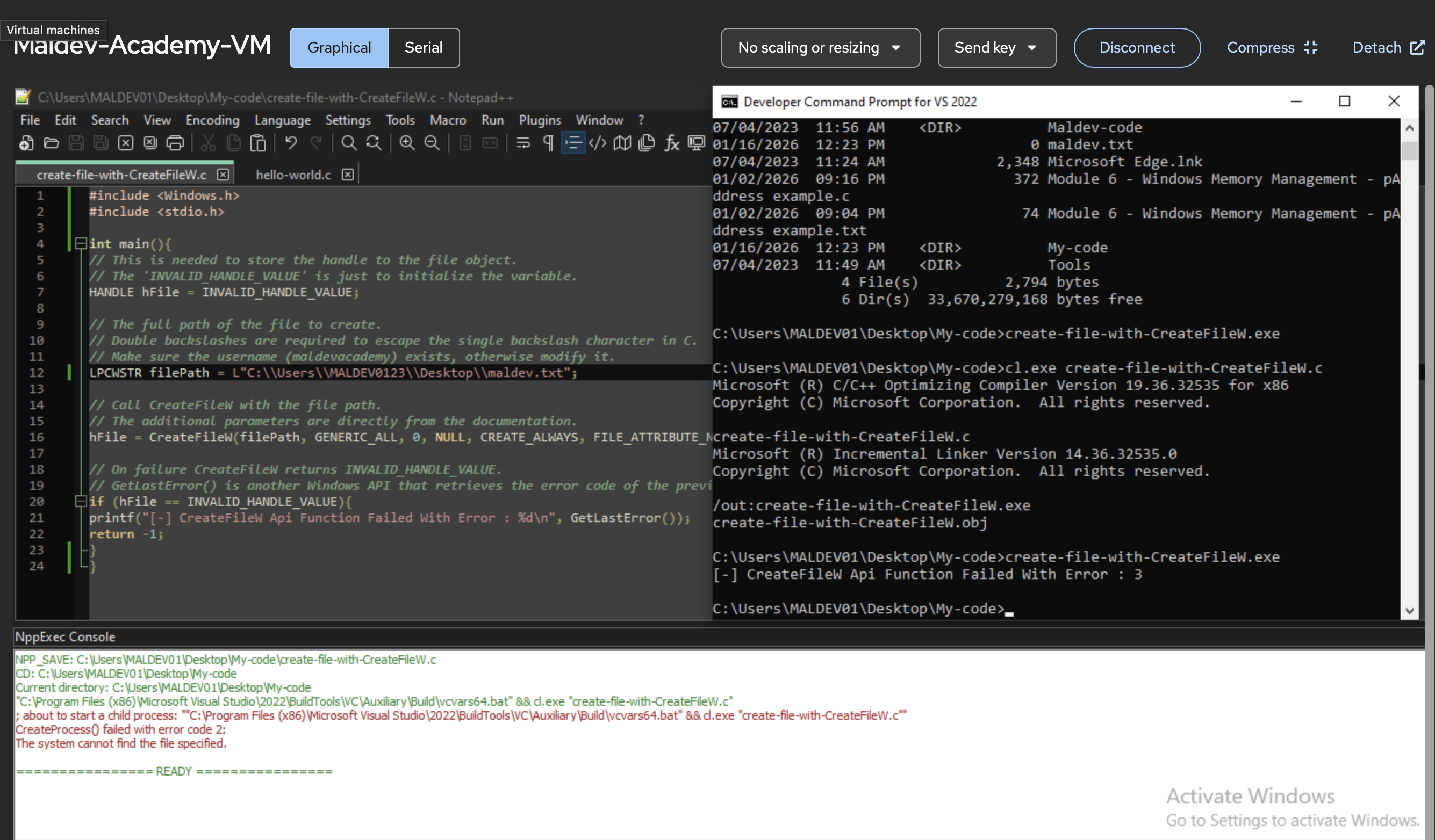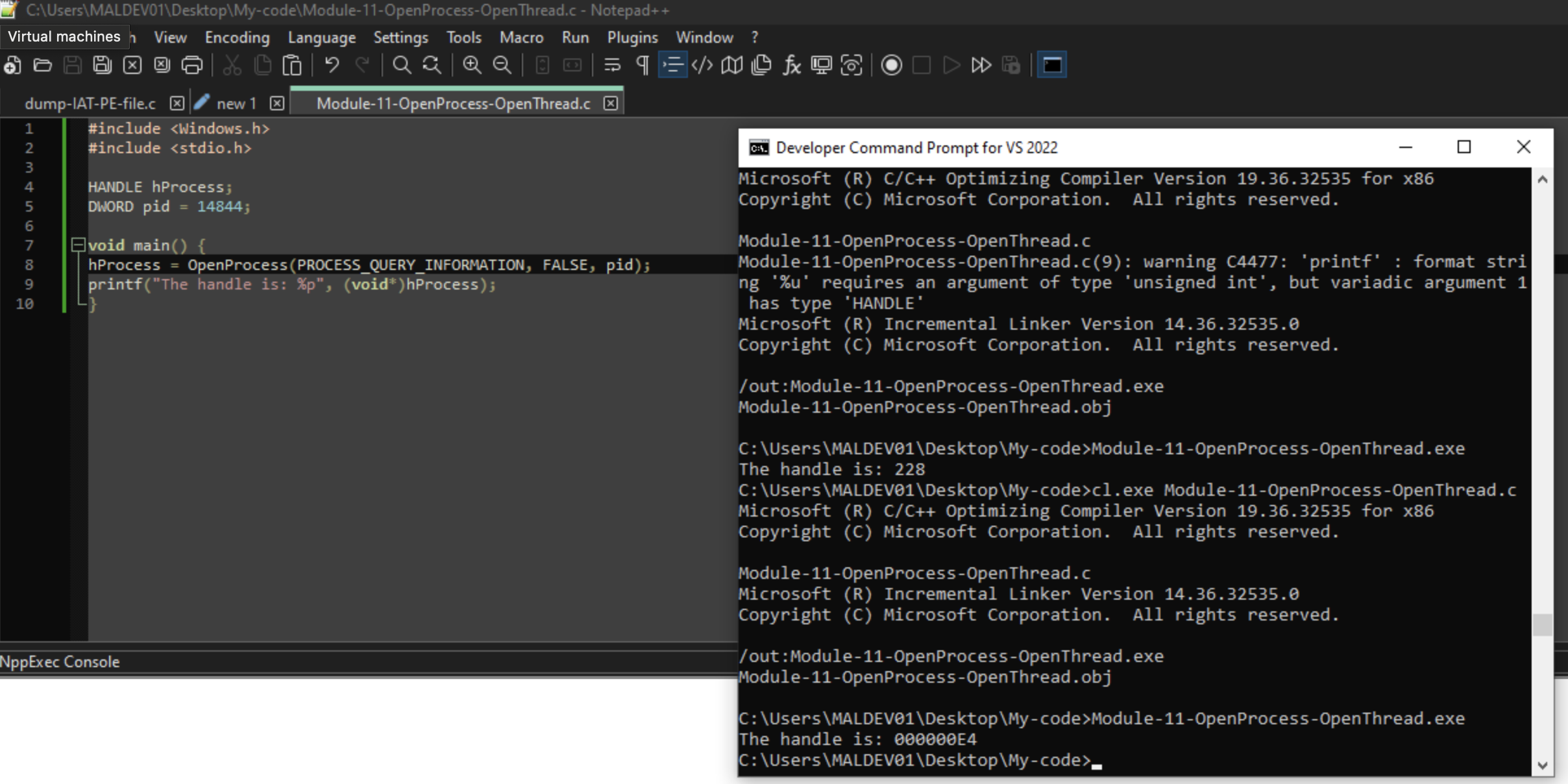 Combining Notepad++ and the Visual Studio Developer Prompt Command Tools I have been able to compile sample/single file code, which is nice for this part of the course.