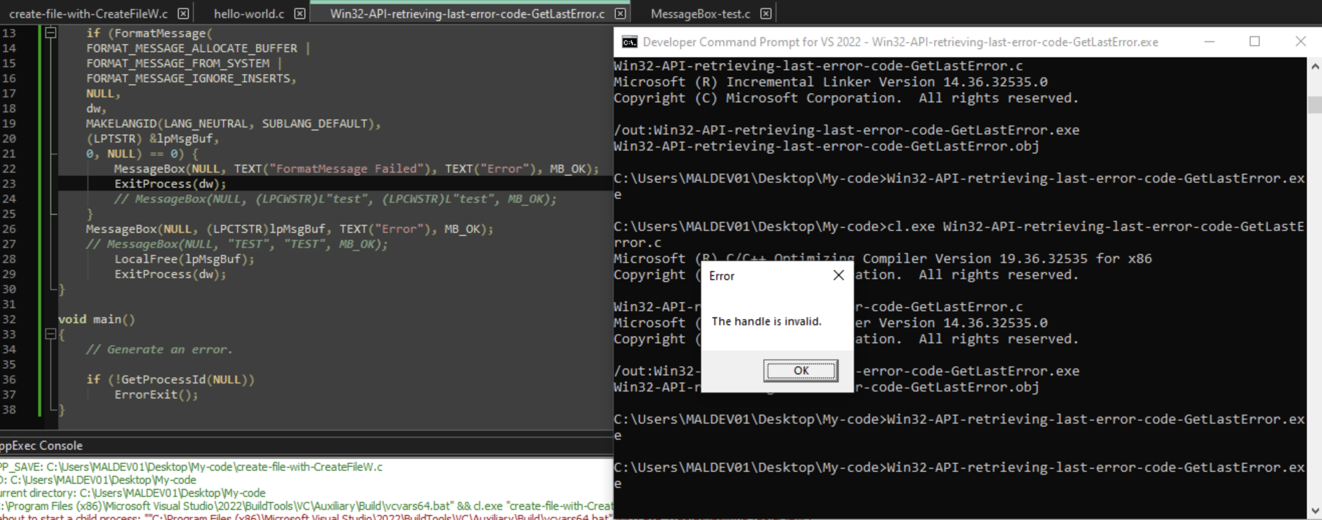 Learning to use the GetLastError function